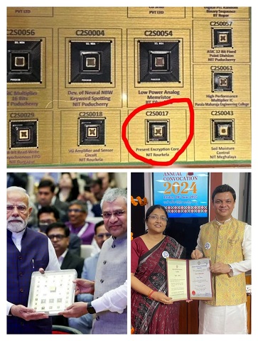 My PhD student, Dr. Ruby Mishra's work on “PRESENT Encryption Core-C2S0017” (Lightweight cipher for IoT-based applications) was presented as a Made in India (indigenous) chip to Hon'ble PM at Semicon-2025. Dr. Ruby Mishra is currently a faculty member at KIIT Bhubaneswar. She did this work at NIT Rourkela with Prof. Manish Okade as Principal Supervisor and Prof. K. K. Mahapatra as Co-Supervisor during her PhD time as a QIP scholar sponsored by KIIT Bhubaneswar (2019-2023). The fabrication of the chip was successfully completed at SCL, Mohali, under the Chip to Startup (C2S) scheme